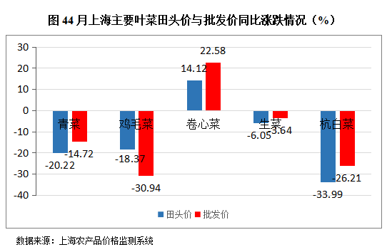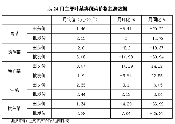 . 根据上海市农产品价格监测系统的数据采集及汇总情况来看:上海市4月蔬菜月均田头价2.08元/公斤,环比下降1.89%、同比下降12.97%;蔬菜月均批发价4.27元/公斤,环比下降12.14%、同比下降2.51%。主要的五类叶菜田头价与批发价监测数据对照情况如下:文章源自:上海蔬菜食用菌行业协会 Shanghai Vegetable & Edible Fungi Industry Associatio上海蔬菜食用菌行业协会-https://www.shsjx.org.cn/15393.html