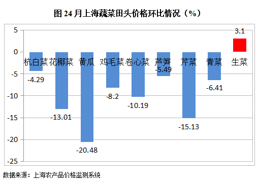 . 根据监测数据,4月份全市监测的9种蔬菜田头价环比,只有生菜为增加,增加了3.1%;另8种蔬菜环比均为下降,降幅最大的为黄瓜,下降了20.48%。文章源自:上海蔬菜食用菌行业协会 Shanghai Vegetable & Edible Fungi Industry Associatio上海蔬菜食用菌行业协会-https://www.shsjx.org.cn/15393.html