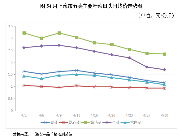 . 4月份五种主要叶菜田头价格整体呈下降趋势。5种蔬菜价格在上旬时有较为稳定,除卷心菜全月比较平稳外,其他4种蔬菜中旬开始整体下降,到4月底为最低价。整个4月份,同一种品类的蔬菜其全月日均最高价与最低价之间最大相差1.01元。