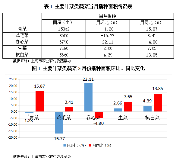 . 上海5月全市平均气温比常年偏高,降水量较常年偏多,日照时数较常年偏少。上旬以晴到多云天气为主,中旬的阴雨寡照天气对蔬菜影响较大,下旬出现了2次较明显降水过程。5月份上海市郊区蔬菜总上市量为208590吨,环比增加24.55%,同比减少0.05%;其中绿叶菜上市量116163吨,环比增加8.39%,同比增加11%。