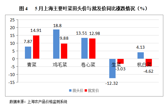 . 根据上海市农产品价格监测系统的数据采集及汇总情况来看:上海市5月蔬菜月均田头价2.02元/公斤,环比下降2.88%、同比上涨5.21%;蔬菜月均批发价3.79元/公斤,环比下跌11.24%、同比上涨4.7%。主要的五类叶菜田头价与批发价监测数据对照情况如下:文章源自:上海蔬菜食用菌行业协会 Shanghai Vegetable & Edible Fungi Industry Associatio上海蔬菜食用菌行业协会-https://www.shsjx.org.cn/15469.html