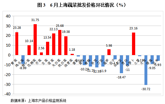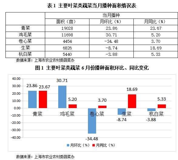 . 上海6月全市平均气温较常年偏高;降水量偏少;日照时数偏少。月内天气以多云为主,有2次较明显降水过程,总体天气适宜,气象条件对蔬菜生长和管理较为有利。6月份上海市郊区蔬菜总上市量为231101吨,环比增加10.79%,同比增加5.66%;其中绿叶菜上市量113594吨,环比减少2.21%,同比增加17.19%。