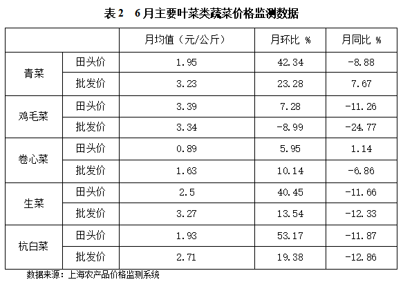 . 根据上海市农产品价格监测系统的数据采集及汇总情况来看:上海市6月蔬菜月均田头价2.43元/公斤,环比上涨20.3%、同比下降7.95%;蔬菜月均批发价3.67元/公斤,环比下降3.17%、同比下降6.62%。主要的五类叶菜田头价与批发价监测数据对照情况如下:文章源自:上海蔬菜食用菌行业协会 Shanghai Vegetable & Edible Fungi Industry Associatio上海蔬菜食用菌行业协会-https://www.shsjx.org.cn/15619.html