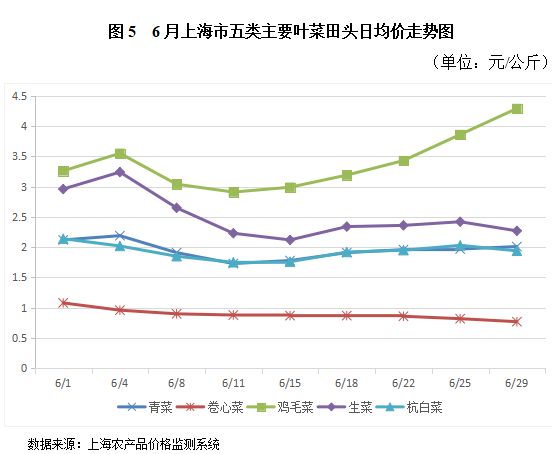 . 6月份五种主要叶菜田头价格整体起伏不大。鸡毛菜和生菜月初价格先涨后跌,跌至月中旬至最低谷,再又逐渐上涨。青菜、杭白菜、卷心菜价格全月走势平稳,波动极小。整个6月份,同一种品类的蔬菜其全月日均最高价与最低价之间最大相差1.38元。