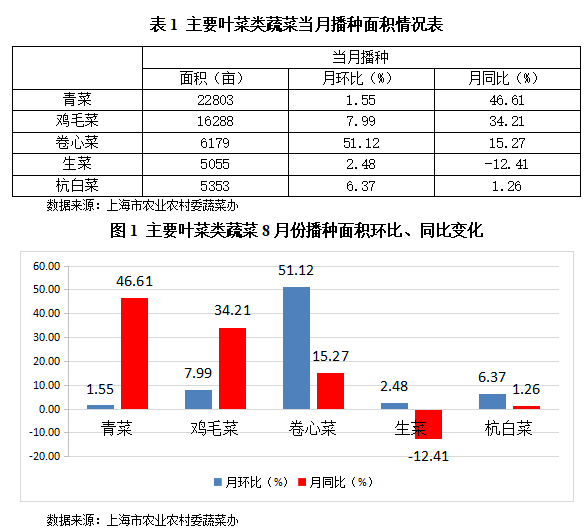 . 上海8月全市平均气温比常年偏高,降水量较常年偏多,日照时数较常年偏少。本月上旬气温基本正常,中旬明显偏低,降水偏多,日照时数偏少,光、温、水等气象条件不利于搁田控苗、施肥等田间管理及病虫害防治;下旬中后期以晴热天气为主,多午后雷阵雨。本月天气条件较适宜蔬菜生长。8月份上海市郊区蔬菜总上市量为189742吨,环比减少13.28 %,同比增加18.90 %;其中绿叶菜上市量97510吨,环比减少12.92 %,同比增加11.14 %。