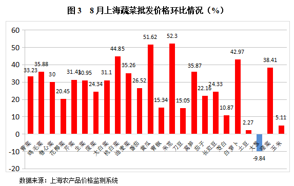 . 根据8月份全市5大批发市场监测的24种蔬菜批发价格数据,环比上涨的有23种蔬菜,涨幅最大的为米苋,上涨52.3%;只有大葱批发价格环比下跌,了9.84%。