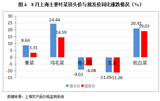 . 根据上海市农产品价格监测系统的数据采集及汇总情况来看:上海市8月蔬菜月均田头价3.52元/公斤,环比上涨28.47%、同比上涨12.82%;蔬菜月均批发价4.75元/公斤,环比上涨24.67%、同比下跌0.42%。主要的五类叶菜田头价与批发价监测数据对照情况如下:文章源自:上海蔬菜食用菌行业协会 Shanghai Vegetable & Edible Fungi Industry Associatio上海蔬菜食用菌行业协会-https://www.shsjx.org.cn/16058.html