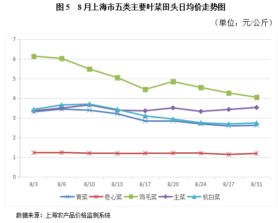 . 8月份五种主要叶菜田头价格受高温和7月底台风过境后的余波影响,5种蔬菜中,除鸡毛菜在月初时价格较高外,其他4种蔬菜价格波动不大。整个8月份,同一种品类的蔬菜其全月日均最高价与最低价之间最大相差2.09元。