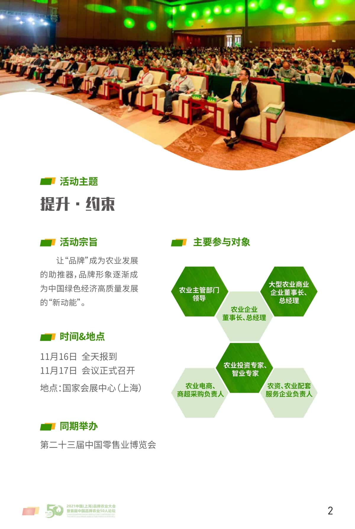. 为贯彻落实2021年中央一号文件精神,全面贯彻实施乡村振兴战略,深化农业供给侧结构性改革,推动品牌农业 高质量发展,按照国家《乡村振兴战略规划(2018-2022)》 中提出的发展农业品牌的新要求,充分发挥中国国际进口博览会后发效应和历届展会成功举办的优势,进行深度整合资源,全方位展示农业产业化龙头企业品牌和区域公用品牌建设成果,推动农业从增产模式转向品牌建设模式,促进农业高质量发展。文章源自:上海蔬菜食用菌行业协会 Shanghai Vegetable & Edible Fungi Industry Associatio上海蔬菜食用菌行业协会-https://www.shsjx.org.cn/16204.html