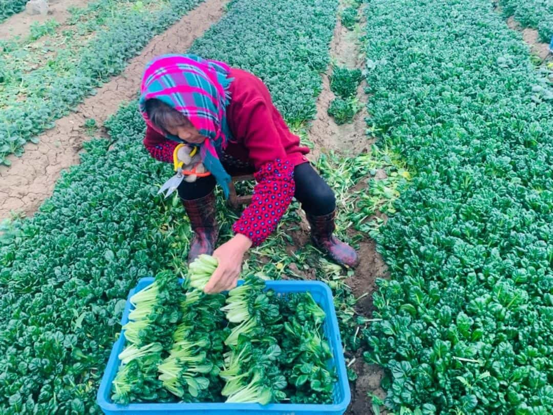 . 农人们在田垄间采摘新鲜的有机蔬菜。