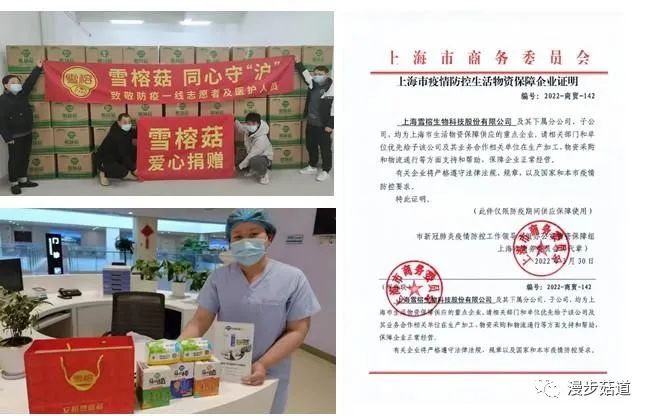 . 作为上海市疫情防控生活物资保障企业,在上海的疫情期间,紧急从外地的工厂调运来食用菌的休闲类加工产品,通过上海市文明办的志愿者协会向瑞金医院总院、瑞金医院质子中心、市志愿者协会等多个基层一线防控点定向捐赠,致敬防疫一线的逆行者,共同助力本市的疫情防控工作。