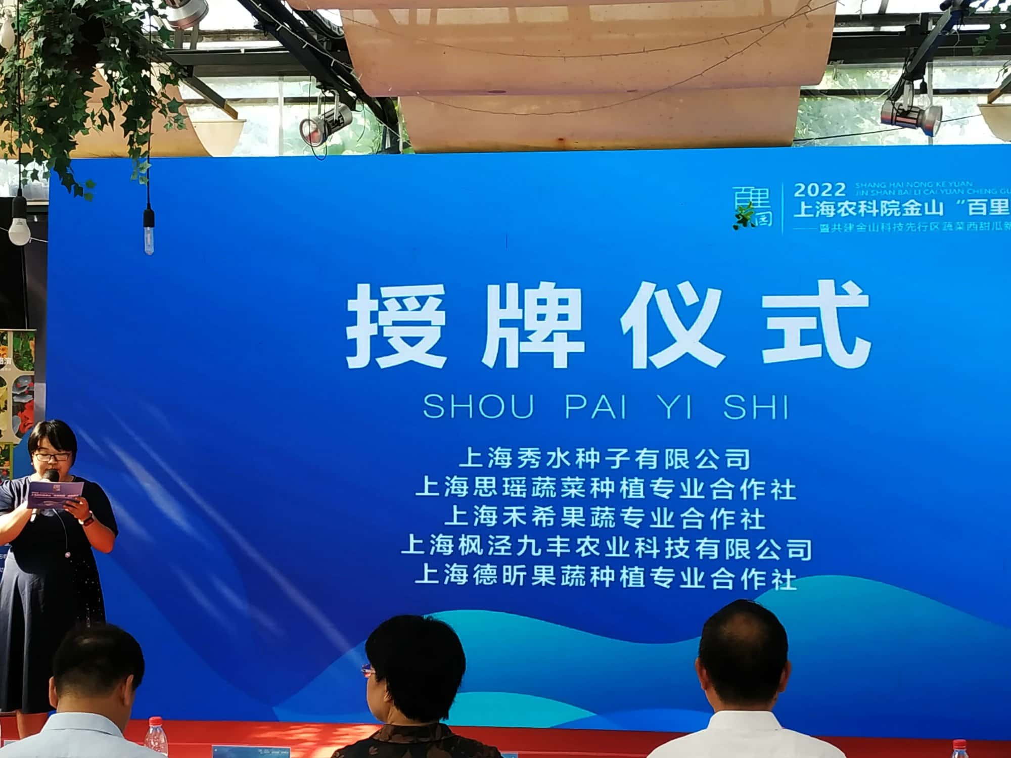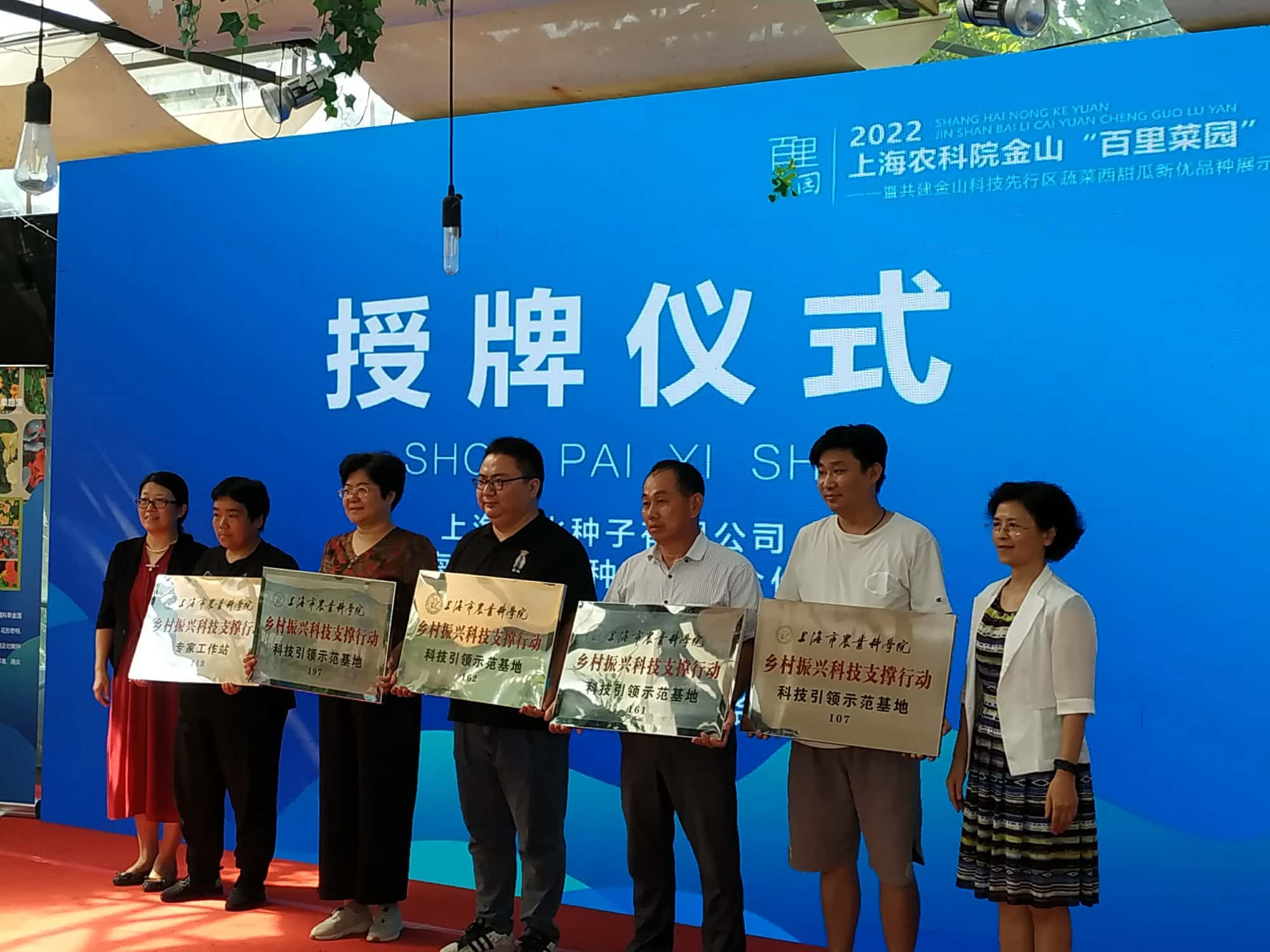 . 市农科院对金山区与该院园艺所合作的乡村振兴示范基地,上海秀水种子有限公司、上海思瑶蔬菜种植专业合作社、上海禾希果蔬专业合作社、上海枫泾九丰农业科技有限公司、上海德昕果蔬种植专业合作社集中授牌。