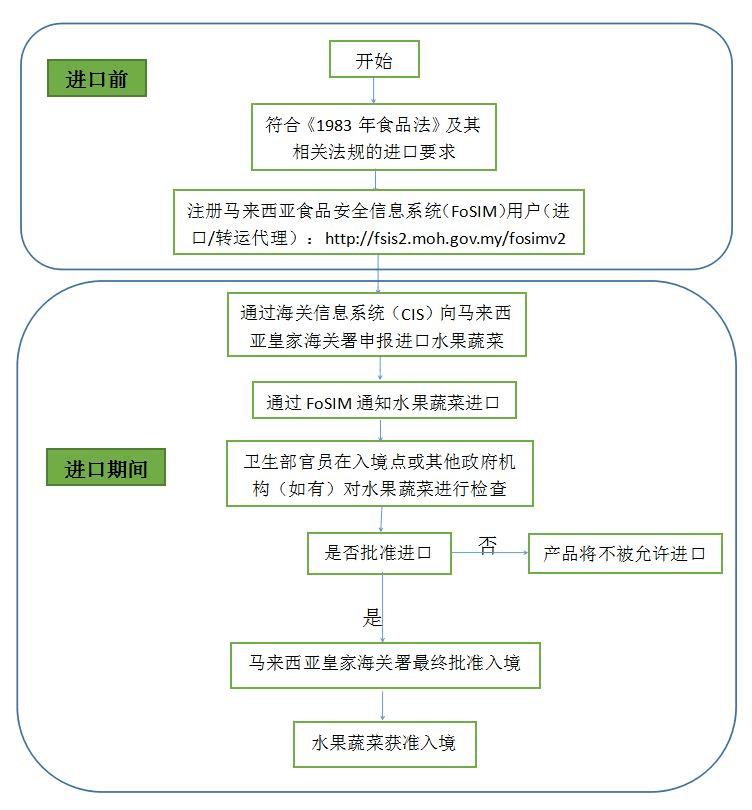1.植物检疫要求。马来西亚依据《植物检疫法(1976)》《植物检疫条例(1981)》等法规对进口水果蔬菜实施植物检疫。进口商在进口时需要向植物检疫处申请进口植物检疫许可证。一般来说,进口检疫许可需逐票货物单独申请,有效期3个月。