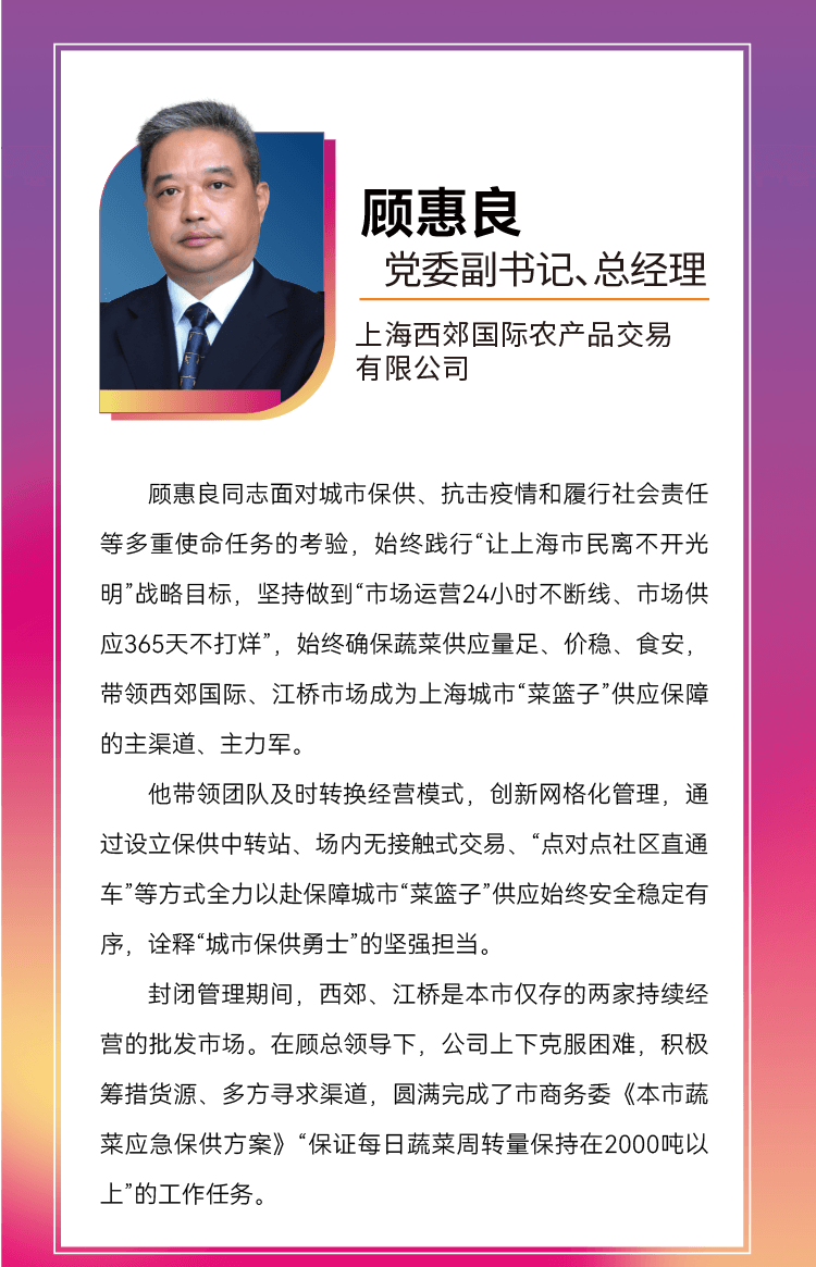 . 西郊江桥市场总经理顾惠良连续100多天驻守市场,多方寻求渠道,保证每日蔬菜周转量保持在2000吨以上,积极调运南方、北方蔬菜近7000吨紧急补给上海,实现供给平衡、平抑物价。文章源自:上海蔬菜食用菌行业协会 Shanghai Vegetable & Edible Fungi Industry Associatio上海蔬菜食用菌行业协会-https://www.shsjx.org.cn/17740.html