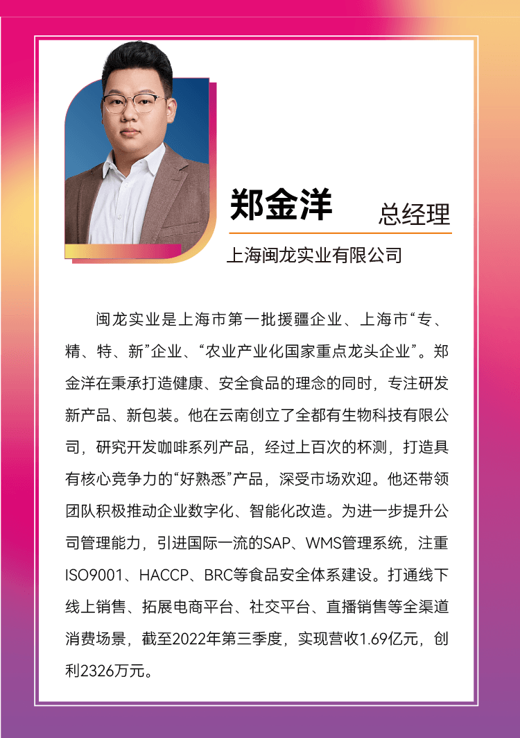 . 上海闽龙实业有限公司在进博会期间,与国外参展企业深入交流学习,在云南怒江州开拓创办云南全都有生物科技有限公司,打造集产品研发、加工生产、渠道销售为一体的现代企业。文章源自:上海蔬菜食用菌行业协会 Shanghai Vegetable & Edible Fungi Industry Associatio上海蔬菜食用菌行业协会-https://www.shsjx.org.cn/17740.html
