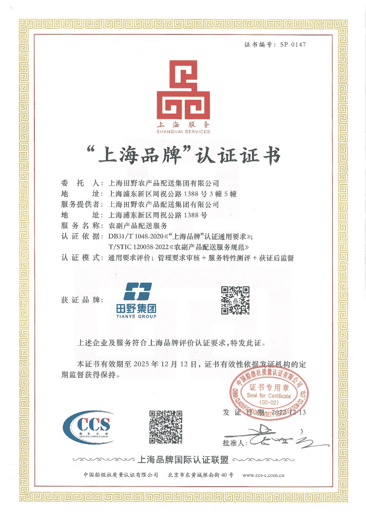 . 近日,我协会理事单位上海田野农产品配送集团有限公司荣获“上海品牌”认证。这是专家对田野集团的企业实力、服务质量、技术创新、管理体系等方面的高度认可与肯定。