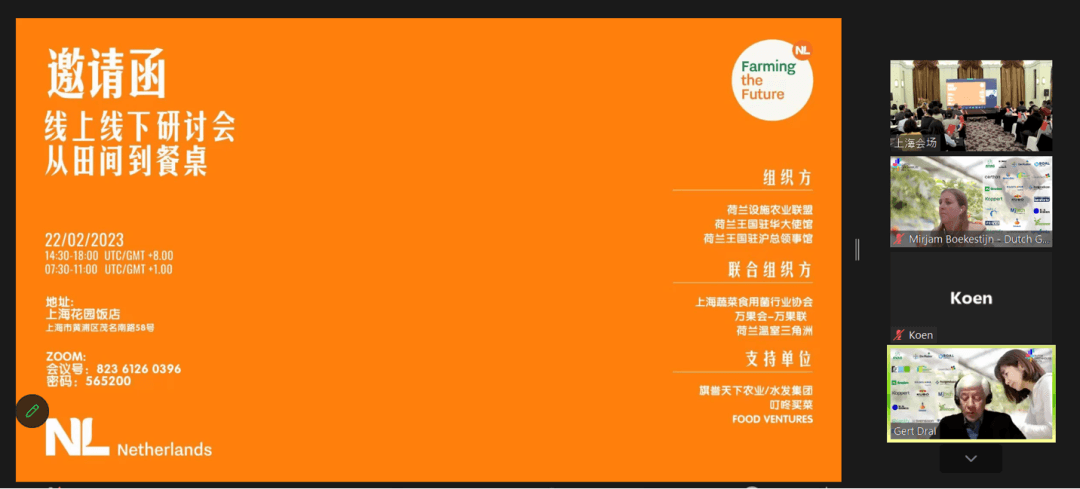 . 随着中国人民生活水平的不断提高,如何保障超大城市食品安全稳定供给,如何满足居民对优质果蔬的需求。为了探讨这些问题,2月22日中荷“从田间到餐桌”线上线下研讨会在上海花园饭店隆重举行。
