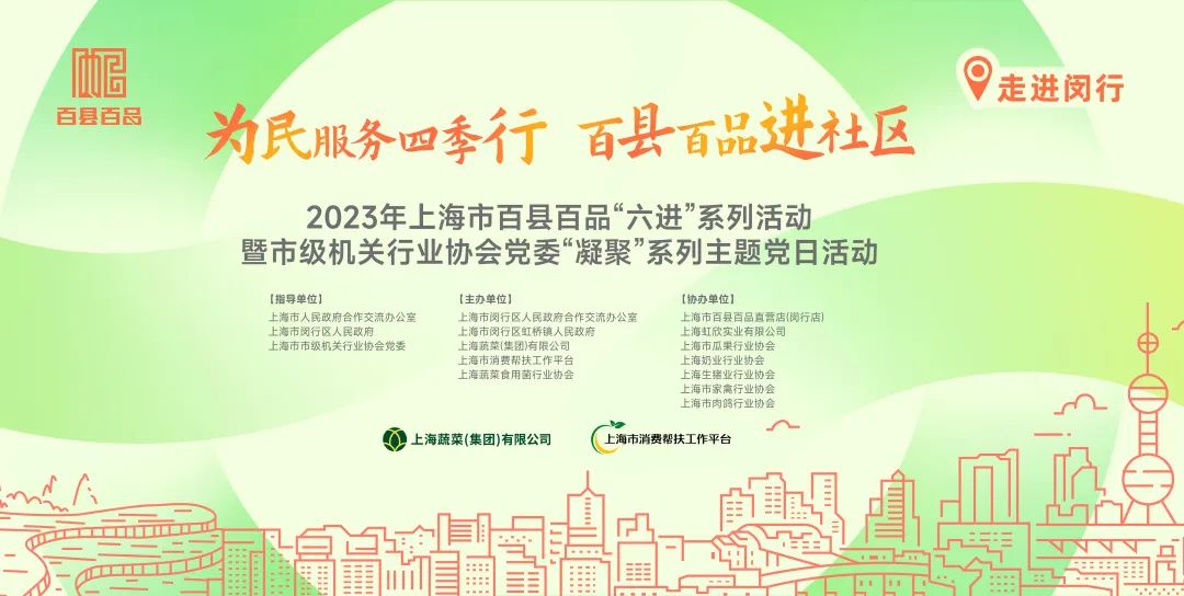 . 为深入贯彻落实中央及市委市政府做大消费帮扶、助力乡村振兴决策部署,在市政府合作交流办的指导下,在大兴调研的主题背景下,6月24日上午,为民服务四季行,百县百品进社区2023年百县百品六进系列活动(进闵行)暨市级机关行业协会党委“凝聚”系列主题党日活动在虹桥镇上虹新村火爆开展。