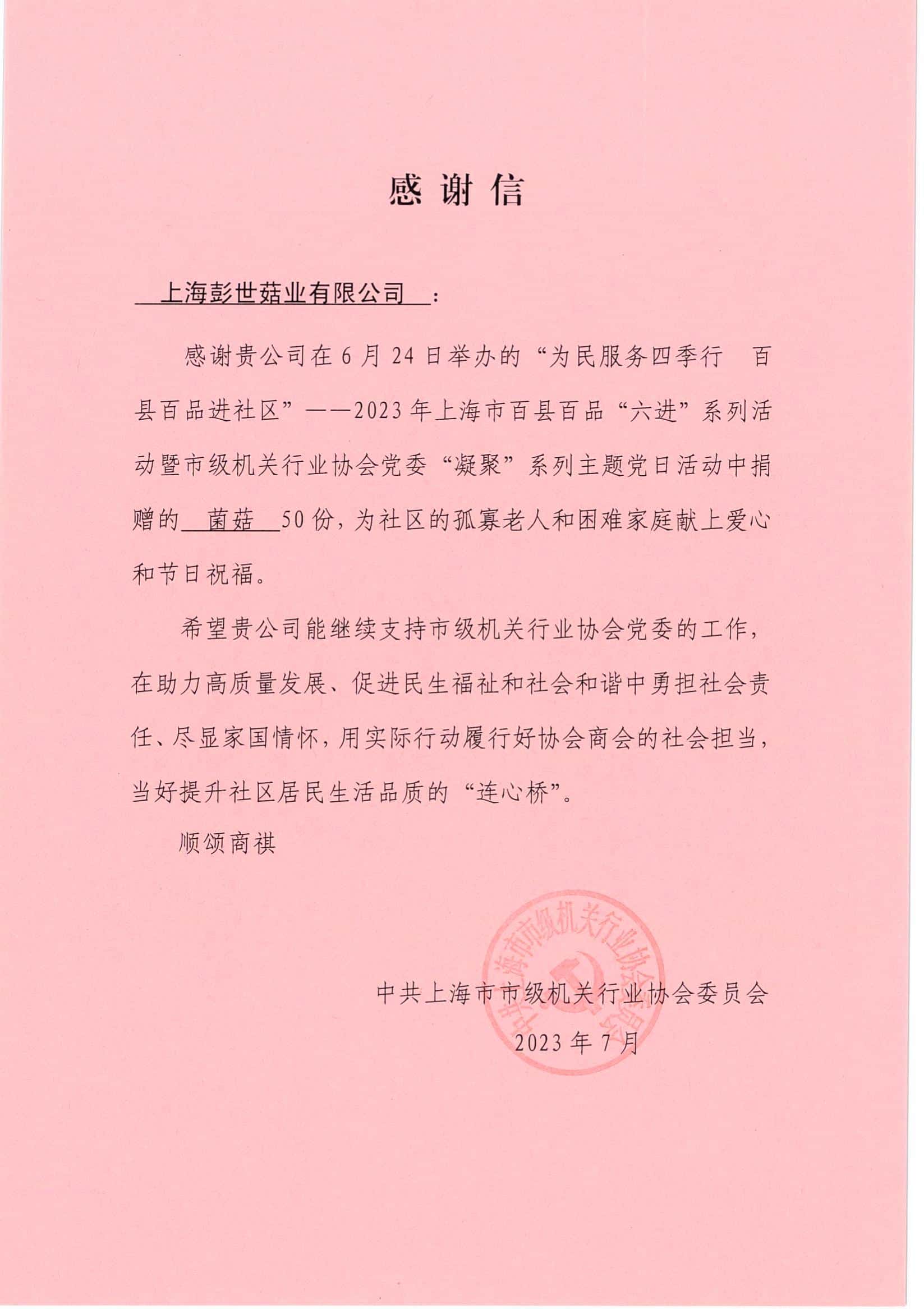 上海彭世菇业有限公司感谢信文章源自:上海蔬菜食用菌行业协会 Shanghai Vegetable & Edible Fungi Industry Associatio上海蔬菜食用菌行业协会-https://www.shsjx.org.cn/18649.html