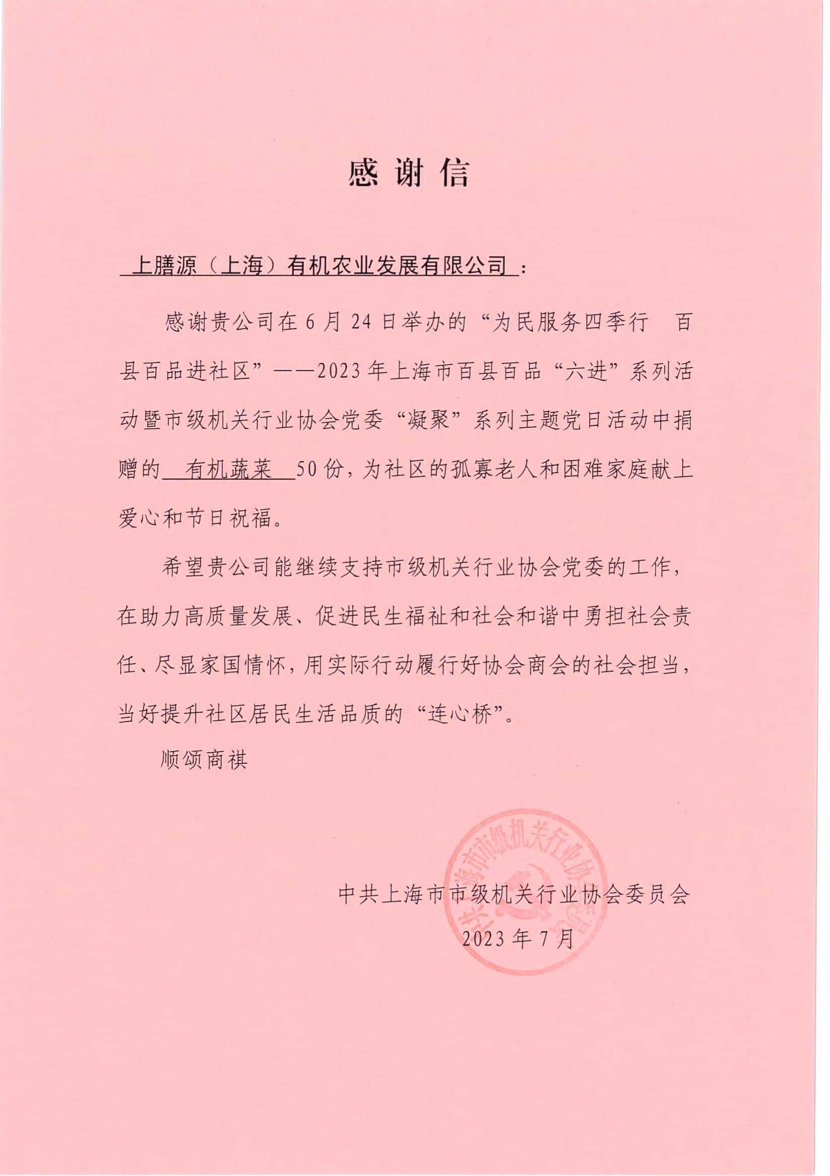 . 近期,协会收到来自上海市市级机关行业协会党委发来的感谢信。信中对我协会三家副会长单位,上海星辉蔬菜有限公司、上海容邦企业集团有限公司、上海彭世菇业有限公司参加“为民服务四季行”第二季主题主题党日活动,为社区的孤寡老人和困难家庭献上爱心表示衷心的感谢,赞扬了三家单位在助力高质量发展、促进民生福祉和社会和谐中勇担社会责任,对三家单位以实际行动履行好社会责任表示高度肯定。