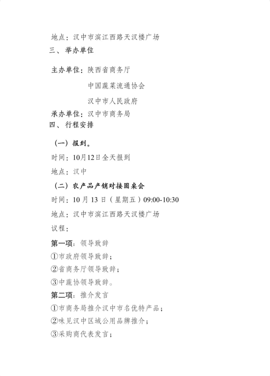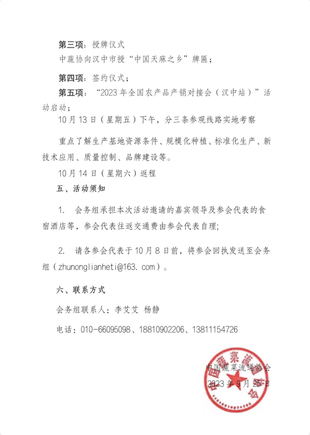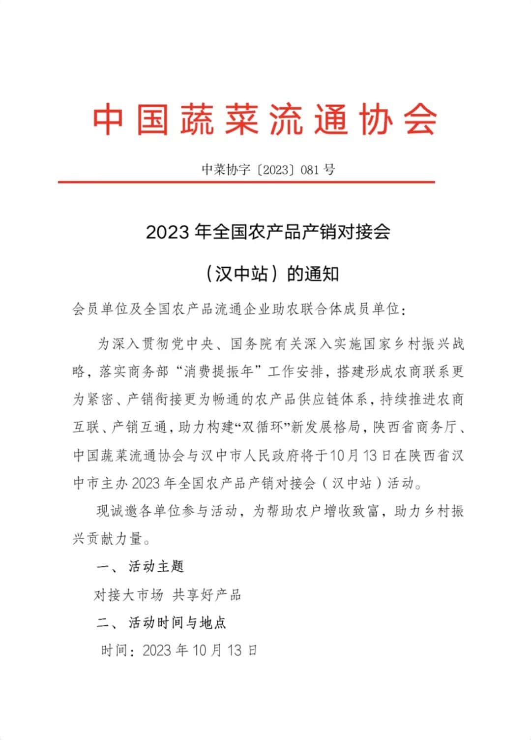 . 接中国蔬菜流通协会通知,为落实习总书记考察汉中的指示精神,持续推进农商互联、产销互通,助力构建“双循环”新发展格局,陕西省商务厅、中国蔬菜流通协会与汉中市人民政府将于10月13日在陕西省汉中市主办2023 年全国农产品产销对接会(汉中站)活动,本次活动将集中展示食用菌方面的产品,企业等。现请有兴趣参加此活动的会员单位联系协会秘书处报名,报名截止日期10月7日,谢谢。联系人:袁老师 021-64389918。