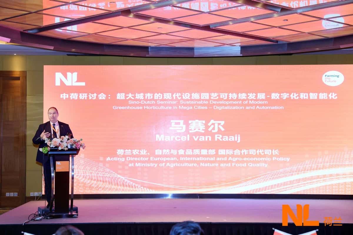 . 11月28日,由荷兰王国驻华大使馆、荷兰王国驻沪总领事馆主办,上海市农业农村委员会、上海市农业科学院大力支持,南荷兰省政府与我协会协办的以“超大城市的现代设施农业可持续发展——数字化和智能化设施农业”为主题的中荷研讨会在上海威斯汀饭店成功举办。 . 对于上海等超大城市而言,保障农产品生产安全和稳定供应,实现可持续发展,是一项责任和使命。荷兰在现代农业和设施农业领域拥有世界领先的技术,温室技术为全球提供了先进的解决方案,能够在极端天气条件下保质保量地全年供应蔬菜。上海作为中荷农业交流的桥头堡,与荷兰在设施农业与园艺产业上的合作紧密。 . 会上,荷兰农业、自然及食品质量部国际合作司代司长马塞尔在开幕致辞中表示,希望通过此次研讨会,中荷双方分享现代设施农业最新技术和经验,加强合作交流,共同探讨超大城市现代设施农业可持续发展方案。 . 此次研讨会由荷兰农业参赞卡雷尔主持,会上5位专家及企业代表作了主旨演讲报告。荷兰设施农业联盟协调员、荷兰温室三角洲执行董事Gert Dral 先生,做了生态系统保证高科技园艺项目的成功的主旨报告。上海市农业科学院研究员丁小涛,做了智能温室在上海的发展和展望—崇明智能温室运行经验探讨的主旨报告。博特门物流中国区首席代表张颖,做了物流增值服务为优化园艺供应链赋能的主旨报告。上海市现代农业投资发展集团战略规划部部长金峰,做了上海现代农业产业园(横沙新洲)的产业结构及其逻辑的主旨报告。瓦赫宁根大学及研究中心温室气候与能源课题组Feije de Zwart 博士,做了数字园艺与人工智能的主题报告。