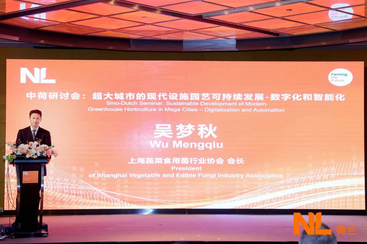 . 我协会会长吴梦秋在致辞上提到,协会一直致力于不断提升整个蔬菜食用菌全产业的可持续、高质量发展。早在20多年前,协会成立伊始,就通过国内外交流合作,学习引进国际先进理念和技术为上海本地农业服务,满足上海城市所需。随着时代发展科技进步,上海市民们的需求也产生了很大变化,我们的农业也突飞猛进,各种现代化科技技术都为农业所用。在这探索科技进步的过程中,我们也深切感受到由于受到相关理念、技术、人才不足的影响,我们离满足上海2500万人越来越高的安全稳定、高品质餐食需求还有一定的差距。而荷兰是全球农产品第二出口国,在国际农产品贸易中占有举足轻重的地位。荷兰的很多技术代表了当今现代农业的发展方向,值得我们上海认真学习、借鉴。希望大家通过积极研讨分享、商务对接、项目参观等多项活动,取得新的进展,不断推进上海这座超大城市现代设施农业的高质量可持续发展。