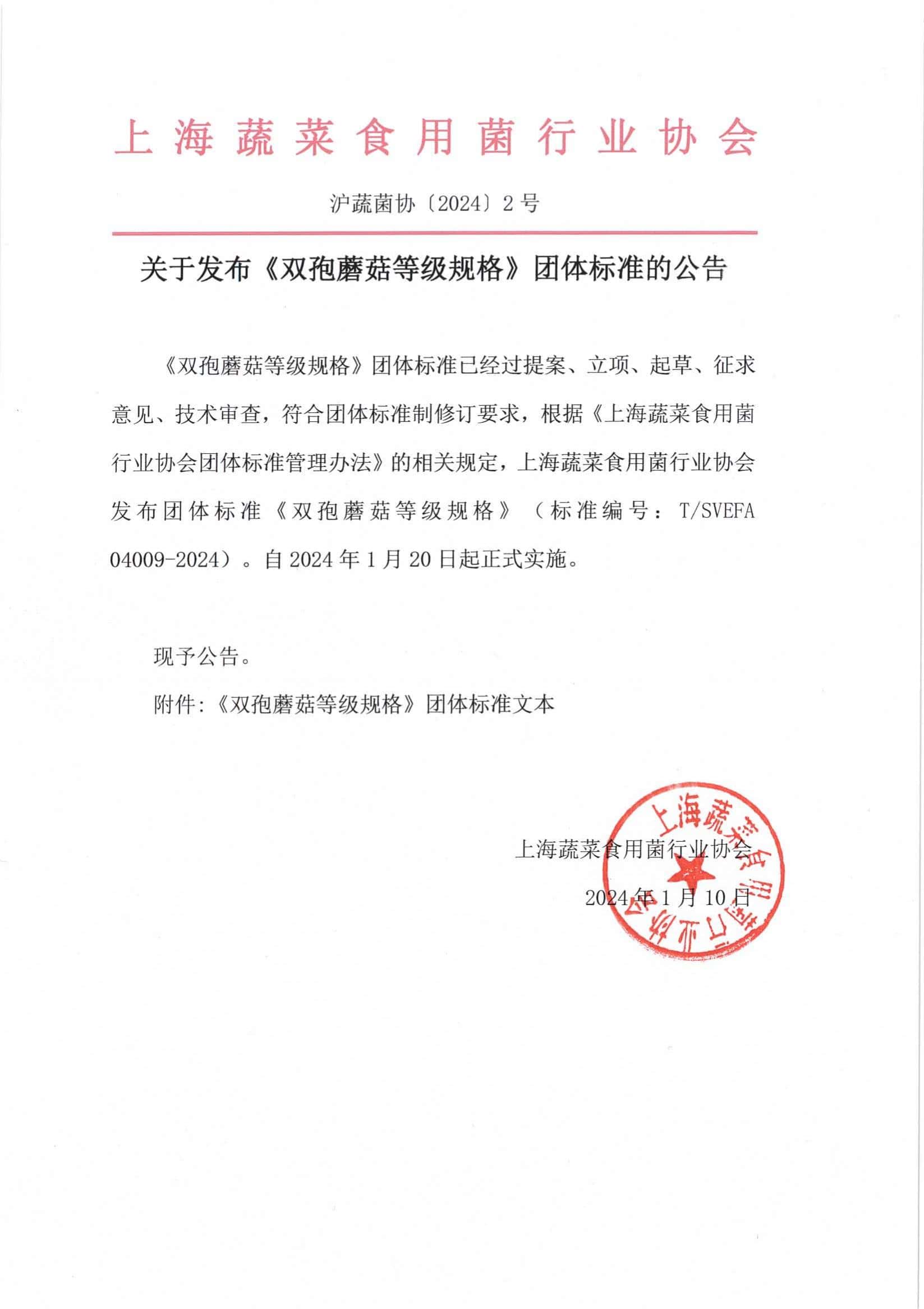 . 《双孢蘑菇等级规格》团体标准已经过提案、立项、起草、征求意见、技术审查,符合团体标准制修订要求,根据《上海蔬菜食用菌行业协会团体标准管理办法》的相关规定,上海蔬菜食用菌行业协会发布团体标准《双孢蘑菇等级规格》(标准编号:T/SVEFA 04009-2024)。自2024年1月20日起正式实施。