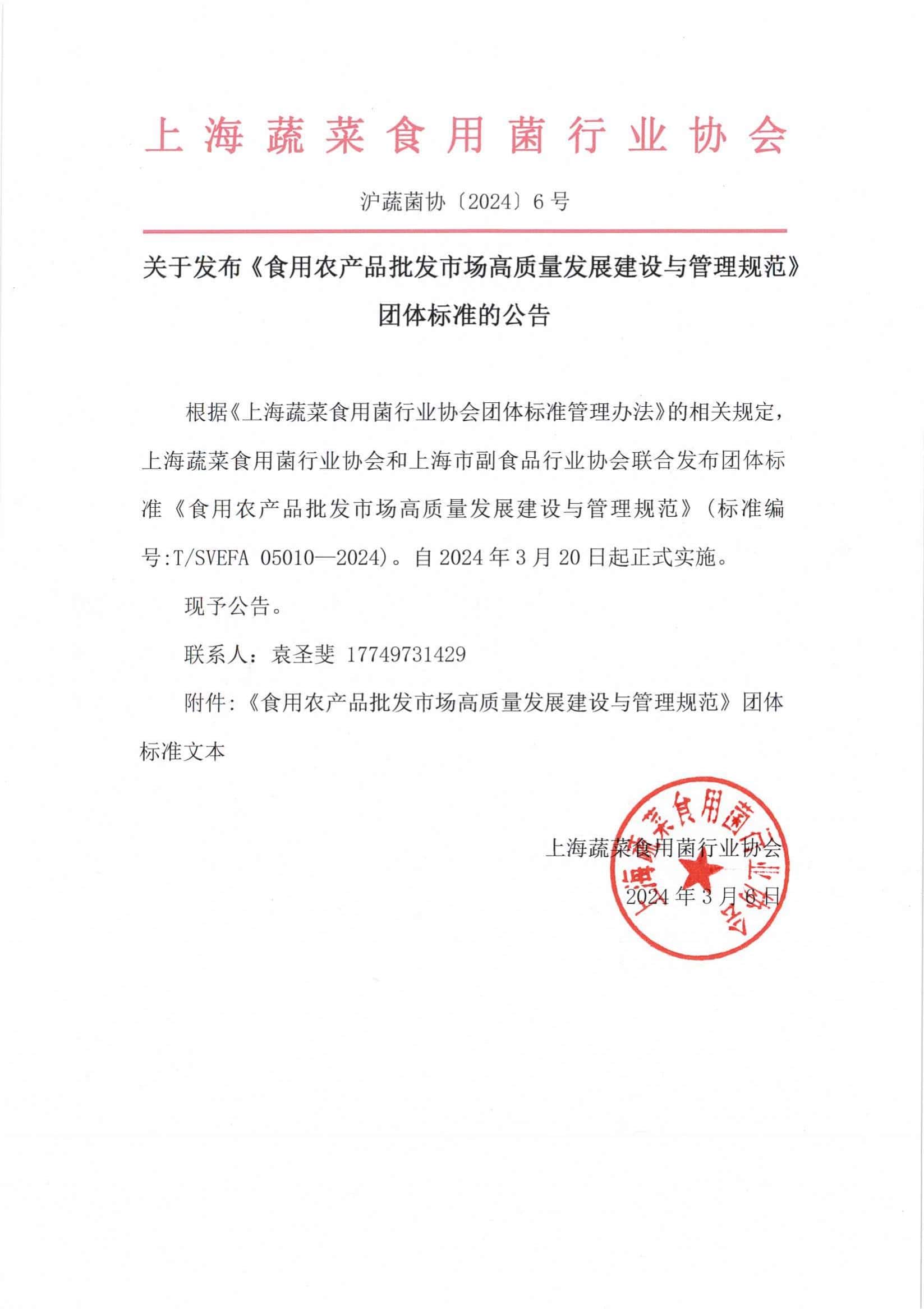 . 根据《上海蔬菜食用菌行业协会团体标准管理办法》的相关规定,上海蔬菜食用菌行业协会和上海市副食品行业协会联合发布团体标准《食用农产品批发市场高质量发展建设与管理规范》(标准编号:T/SVEFA 05010—2024)。自2024年3月20日起正式实施。