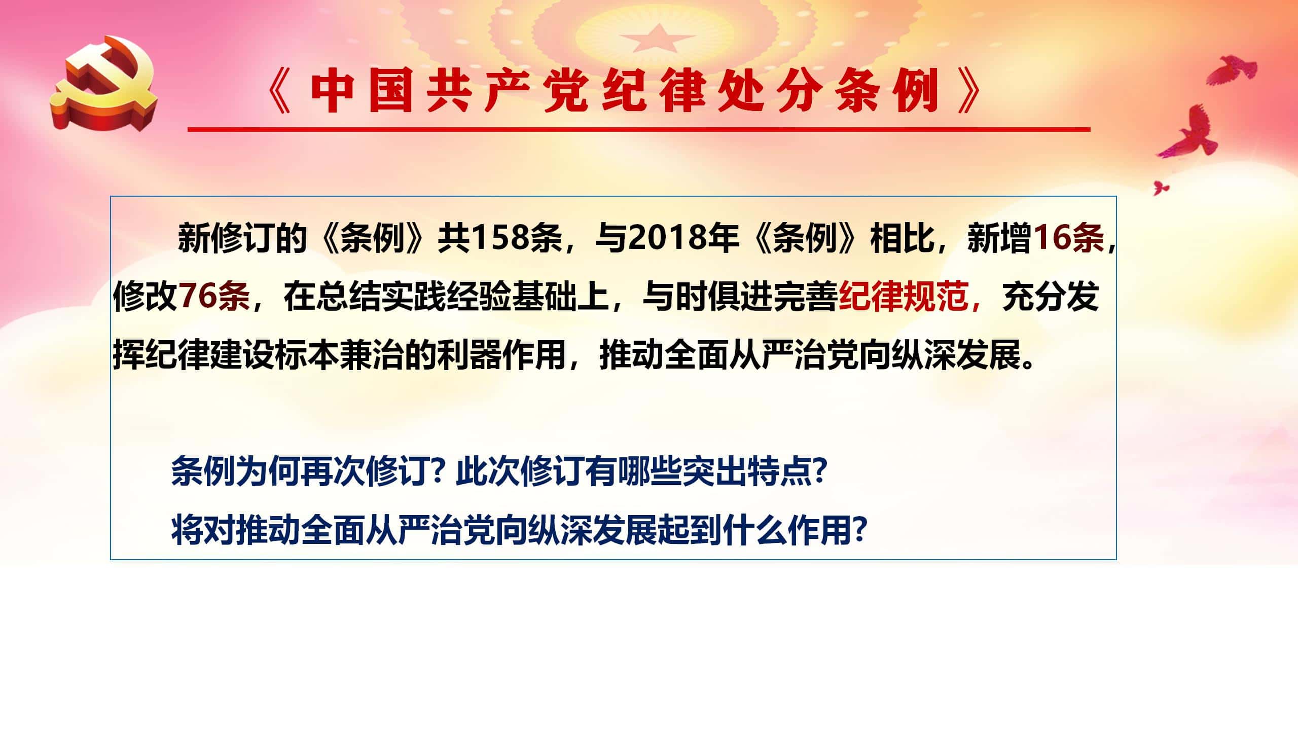 . 接着,吴梦秋书记给大家做《中国共产党纪律处分条例》的专题党课。吴书记用ppt 的形式给大家详细作了《中国共产党纪律处分条例》介绍与解读,他从《条例》修订的重要意义、修订解读和以严明的纪律推进党的自我革命三方面开展学习导读。文章源自:上海蔬菜食用菌行业协会 Shanghai Vegetable & Edible Fungi Industry Associatio上海蔬菜食用菌行业协会-https://www.shsjx.org.cn/19663.html . 《条例》修订重要意义有四:促进全党深刻领悟“两个确立”的决定性意义、坚决做到“两个维护”的必然要求;贯彻落实习近平新时代中国特色社会主义思想的具体行动;坚持问题导向,用严明的纪律管全党治全党的现实需要;总结从严管党治党经验、实现制度与时俱进的实践要求。《条例》修订亮点有三:以习近平新时代中国特色社会主义思想为指导,全面贯彻党的二十大精神;突出问题导向,坚决纠治形式主义、官僚主义等重点、难点问题;坚持与时俱进,在总结从严管党治党经验基础上完善纪律规范。以严明的纪律推进党的自我革命的要求有三:在服务党和国家大局中学习领会《条例》的主旨要义;加强党纪教育,增强遵规守纪自觉;敢于善于斗争,严格精准执纪。文章源自:上海蔬菜食用菌行业协会 Shanghai Vegetable & Edible Fungi Industry Associatio上海蔬菜食用菌行业协会-https://www.shsjx.org.cn/19663.html . 吴梦秋书记强调此次对《条例》的宣贯仅是一次概括的学习导读,各位党员应在工作之余原原本本读原文,深入学习贯彻《条例》内容,切实发挥纪律建设标本兼治的利器作用,为各协会的自律建设和高质量发展提供纪律保障。