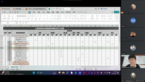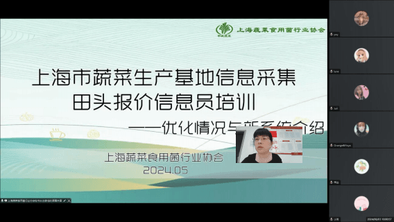 . 6 月 3 日,为深度贯彻落实市农业农村委对上海市蔬菜价格监测工作新要求,协会通过 “腾讯视频 ”线上举办“2024 年上海市田头价格信息采集线上培训会 ”。本次培训为传达我 市蔬菜田头价格采集工作最新要求,讲解报送品类、指标要求变化,总结点位优化情况,并 介绍更新后报送系统的使用方式。培训由协会秘书长庄奇佳主持并作指导,各区报送管理员、 报送点位负责人等相关人员80 余人线上出席了本次培训会议。