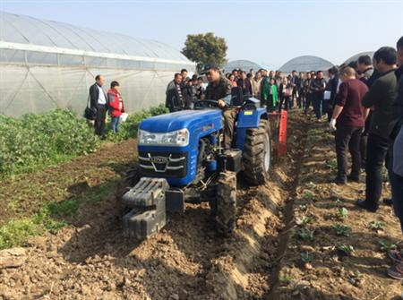 与会人员首先听取了农机生产厂家的介绍,随后现场观看了农机的应用效果,对配套马力、适用范围等情况做了详细的了解。现场会上展出了深耕机、旋耕灭茬整平机、自走式起垄机、树枝粉碎机等新型蔬菜种植管理机械。目前蔬菜保护地土壤多呈板结、盐碱化现象,现有的翻耕机械的耕深只有15cm左右,不能满足改善土壤质地的要求,现场展出的璟田深耕机的翻耕深度可达50cm,能够有效改善土壤盐碱化现象,建立一个疏松透气的根域环境,提高作物抗病性,提高蔬菜产量的同时又能减少农药、化肥的施用量;旋耕灭茬整平机能够高效的将野草、蔬菜秸秆打碎埋到地里,一次性实现旋耕、灭茬、整平三项作业,省工省时。文章源自:上海蔬菜食用菌行业协会 Shanghai Vegetable & Edible Fungi Industry Associatio上海蔬菜食用菌行业协会-https://www.shsjx.org.cn/2539.html