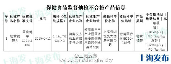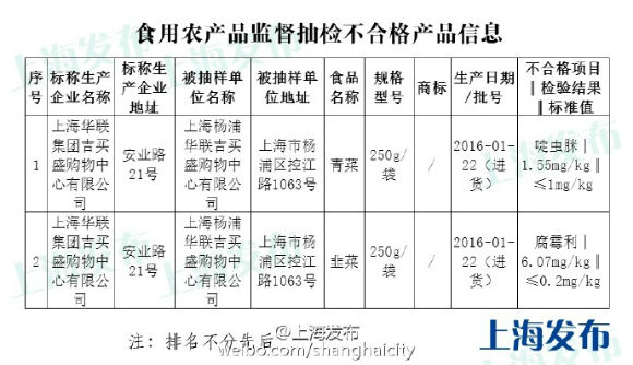 东方网5月11日消息:据上海市政府新闻办公室官方微博消息,上海食药监公布今年2月对上海蔬菜、保健食品类抽检结果:共抽检蔬菜80批次,其中上海杨浦华联吉买盛购物中心的青菜检出啶虫脒剂量不合格,该购物中心的韭菜检出腐霉利剂量不合格;抽检保健食品102批次,其中河南汉方药业生产的祛黄褐斑丸检出铅和总砷指标不合格。