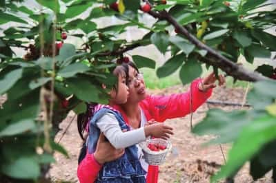 尽管天公不作美,下起大雨,仍然抵挡不住市民前来采摘樱桃的兴致。在2016嘉定菊园樱桃文化节开幕现场,近百名市民带着孩子、穿着雨衣,钻进大棚内采摘甜樱桃(如图)。