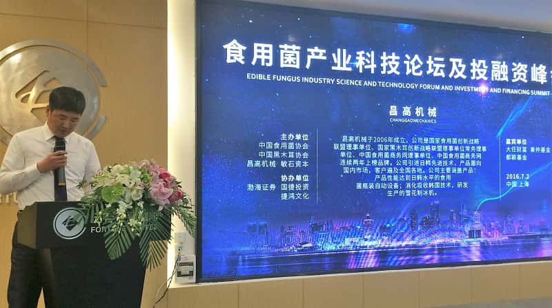 7月2日,协会秘书处孙占刚副秘书长参加了我会员单位上海昌高机械有限公司举办的“2016年食用菌产业科技论坛暨投融资峰会”。据悉,昌高机械与敏石资本合作,正在启动“新三板”上市工作,届时我行业协会又将有一家企业进入资本市场。
