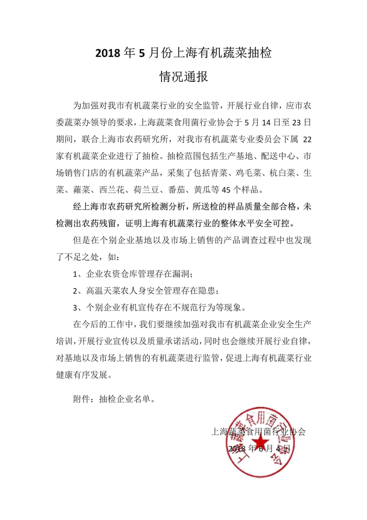 · 为进一步加强我市有机蔬菜企业的监管力度,5月14日至16日,协会秘书处应市农委蔬菜办的要求,陪同第三方农残检测机构对我协会有机蔬菜专业委员会下属青浦、嘉定、金山、奉贤、崇明区的中穗农业、食全食美、百蒂凯、城市蔬菜合作社、浩丰果蔬、阿林果业、艾妮维合作社、星辉蔬菜、壹亩田、中新农业、万禾农业、好客农业、君地生态农业等有机蔬菜企业进行抽样送检。现将检测结果公布如下: