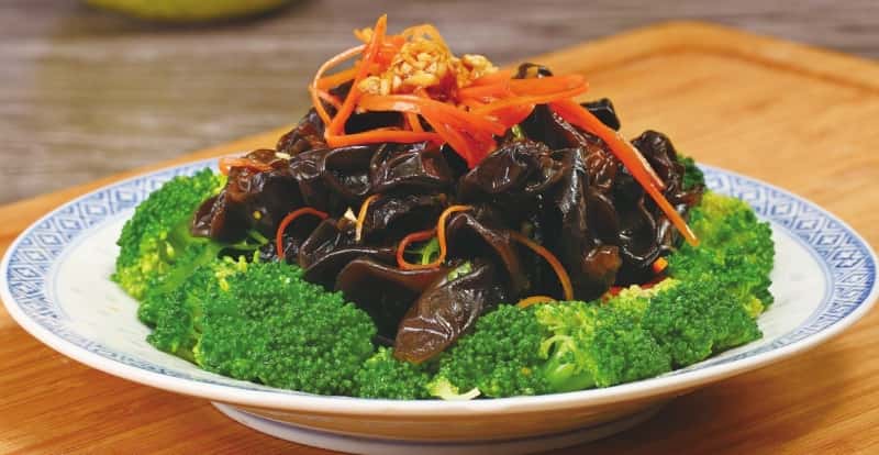 11、将西蓝花、黑木耳、胡萝卜沥干水分,放入一个大碗内。