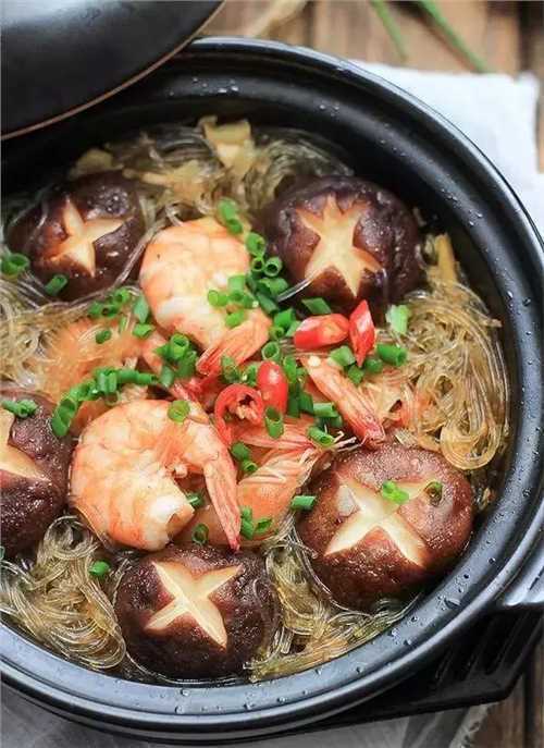 香菇、虾、粉丝、红辣椒、葱、姜、蒜、盐、酱油、油、白酒