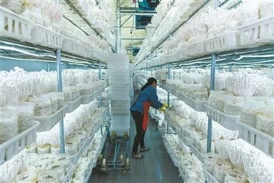 别看金针菇身材纤细,但也是娇嫩得很。工厂化生产要按照菌类生长需要,通过温控、湿控、风控、光控设备,人工模拟生态环境,不受外界环境影响,一年四季均能稳定地进行生产。而栽培方式也是通过机械进行装瓶、灭菌、自动接种、机械搔菌,培养室、生育室都采用标准空调厂房,除了菌类的生长环节,采收也都是机械设备自动化操作。