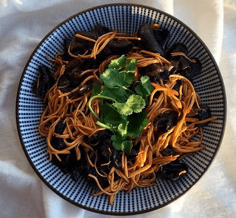 用料:虫草花 80克、干黑木耳 6克、鱼露 1调羹、香醋 1调羹、麻油 1调羹、白砂糖 2小勺、香菜 少许、