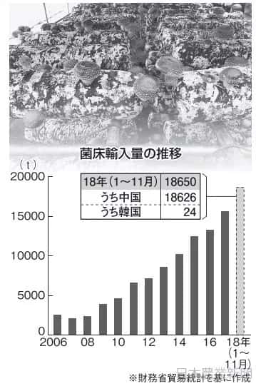 . 2018年のシイタケの植菌済み菌床の輸入量が過去最高となった。財務省の貿易統計によると、1~11月の輸入量は1万8650トン。12月分の結果が出るのを待たずに、これまでの最高だった17年実績(1万5649トン)を上回った。輸入菌床は国産に比べて安く、発生したシイタケは国産として販売できるため、国内産地は危機感を強めている。